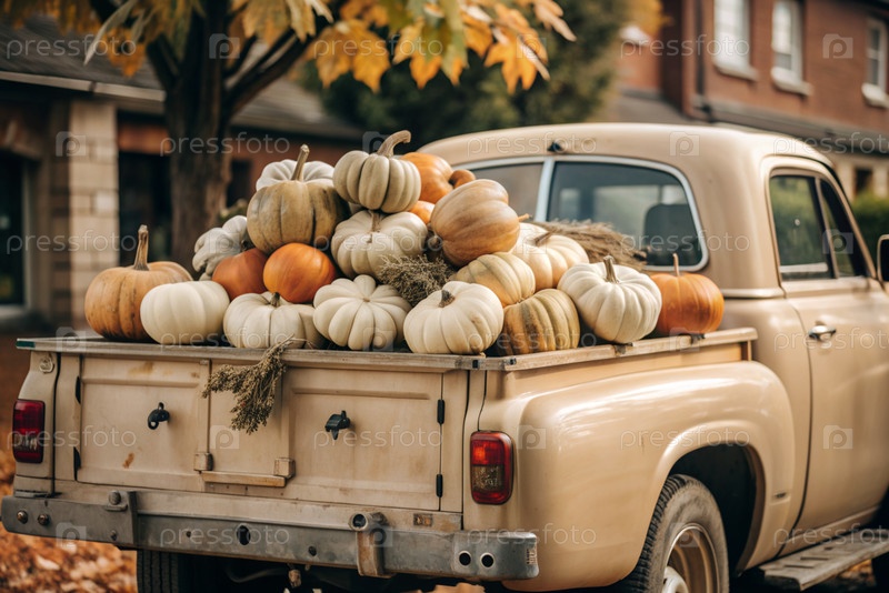 Осень, осенний дизайн.Большой урожай тыквы на заднем сиденье ретро-пикапа, крупный план