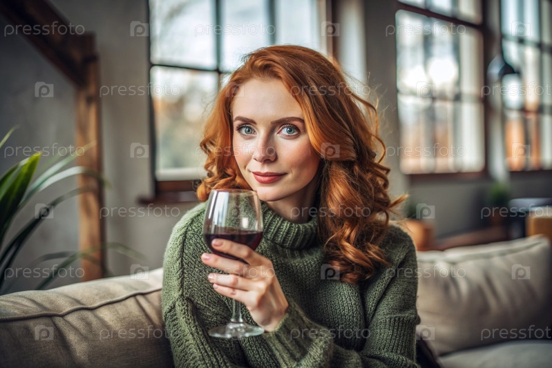 Современная, стильная, красивая женщина с рыжими волосами и бокалом красного вина на стуле в гостиной дома