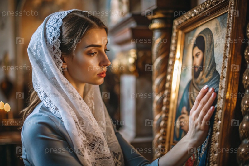 Портрет красивой молодой женщины с платками в православной церкви.Девушка молится в церкви среди икон