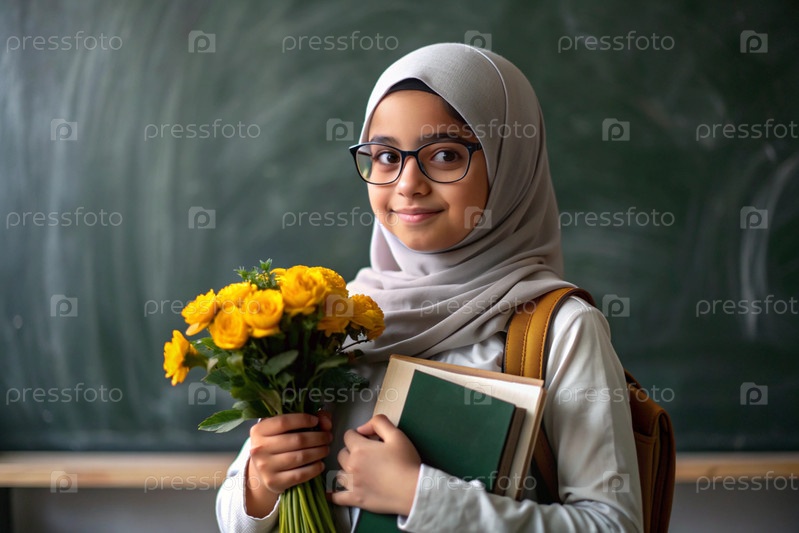 Первоклассник-мусульманин с очками на доске. Девушка держит цветы в руках. Ребенок пойдет в школу впервые. Ребёнок с рюкзаком, книгой и цветами. Возвращение к школе