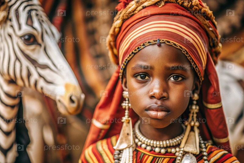 Красивая африканская девушка в традиционном национальном костюме против зебры портрет символизирует традиции и красоту африканского народа