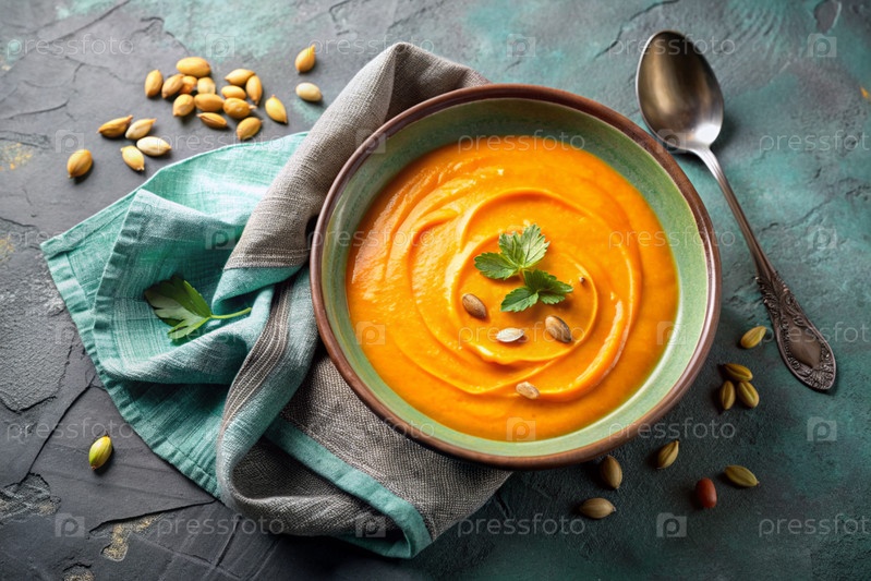 Традиционный мягкий тыквенный кремовый суп с сливками и семьями тыквы на бирюзовом бетонном фоне