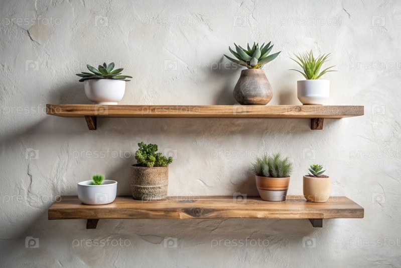 Детали дизайна интерьера. На яркой стене расположены деревянные полки с горшковыми растениями. Скандинавский стиль