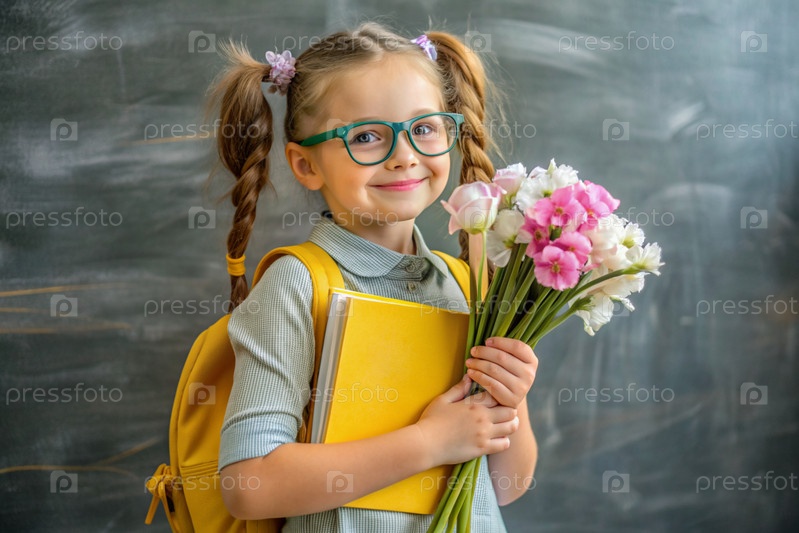 Красивая первоклассница с очками и коньими хвостами на голове. Букет осенних цветов. Ребенок впервые идет в школу. Ребёнок с рюкзаком, книгой и цветами. Возвращение в школу