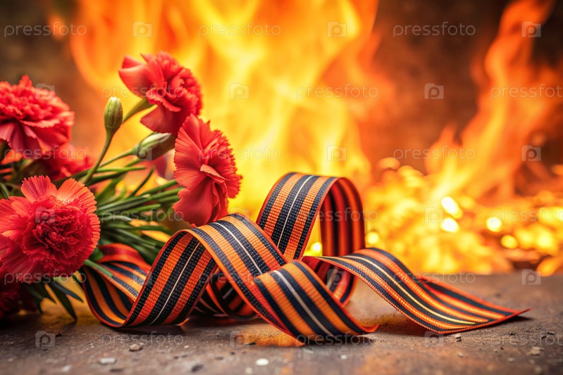 Знамя 9 мая Красные гвозди и Георгиевская лента на фоне огня Концепция Дня Великой Победы 1941-1945 годов и День защитника Отечества
