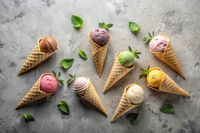 сладкий десерт. морозильные шишки с различными вкусами на бетонном сером фоне. Всемирный день мороженого