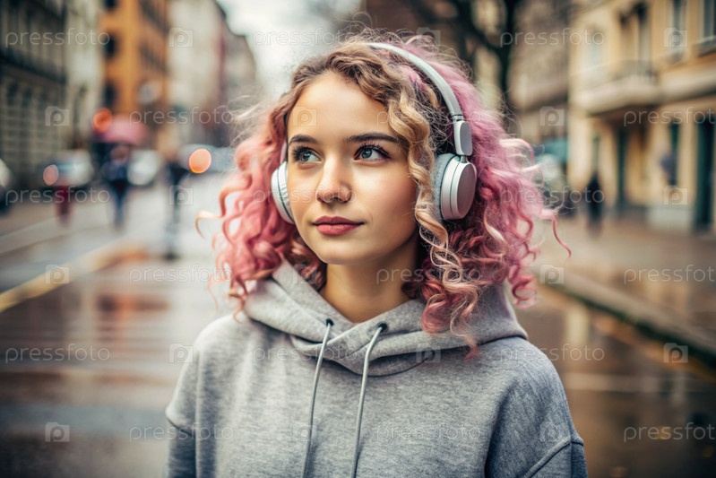 Молодая красивая кудрявая женщина с розовыми волосами слушает музыку на наушниках на вечерней улице города.Мир, гармония, отдых и расслабление