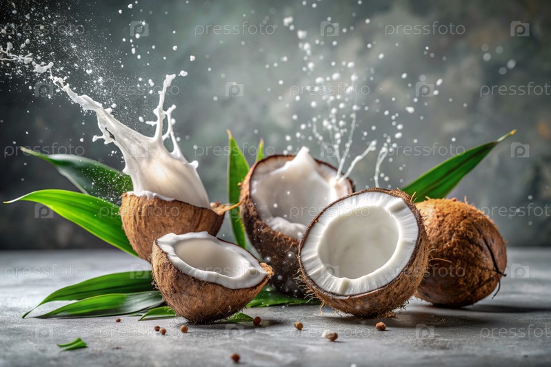 брызги кокосового молока и пальмовых листьев. Брызги молока - кокосы на сером фоне. Баннер для сладостей, курортной косметики или кремов по уходу за телом и лицом