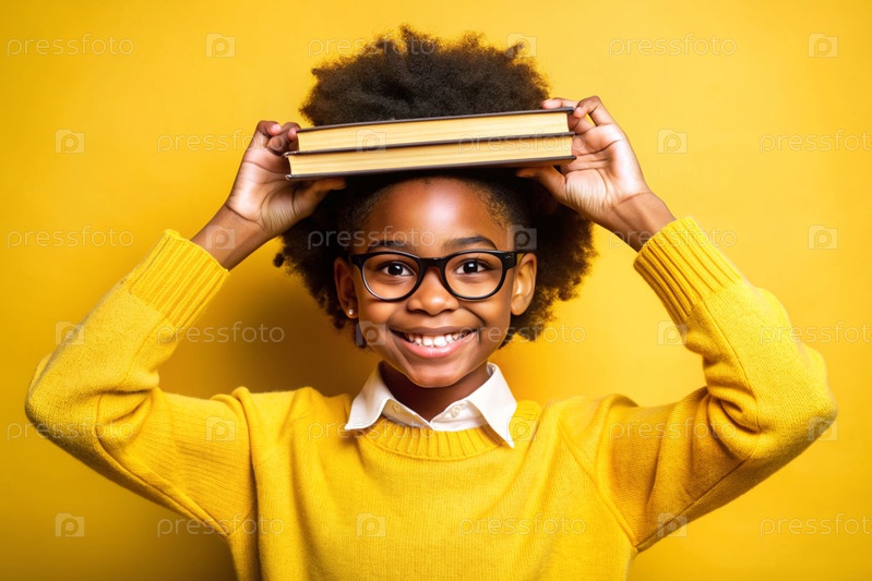 Красивая афроамериканская девушка с очками и книгами. Ребенок впервые ходит в школу. Ребёнок на желтом монохромном фоне