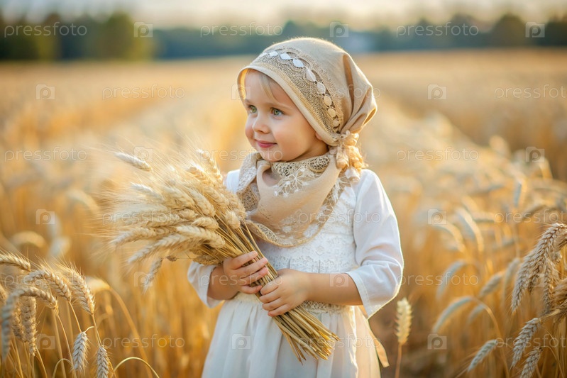 Русская девушка в белом платье и русском шале держит золотые колосья пшеницы на фоне созревающего поля. Концепция посадки и сбора богатого урожая. Сельский пейзаж