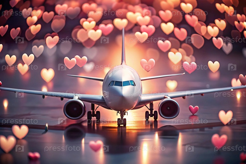Любовное путешествие. Самолет и сердца вокруг. Подарок для любимого человека в День святого Валентина похож на романтическую поездку. Баннер с предложениями и акциями от туроператора