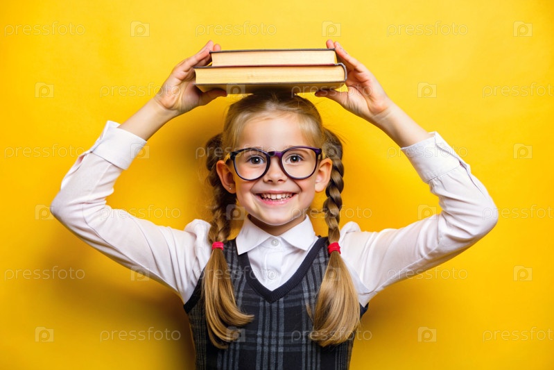 Красивая девушка с очками и книгами на голове. Ребенок впервые ходит в школу. Ребёнок на желтом монохромном фоне. Возвращение к школе
