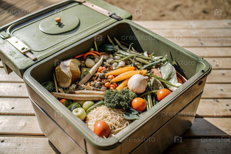 Открытый контейнер для компоста с кожурой и фруктовыми и овощными обрезками.Органические отходы в садовом компостере.Экологическое садоводство, устойчивость, экология