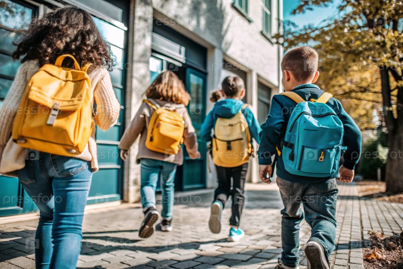 Праздник приходится на 1 сентября. Дети с желтыми рюкзаками бегут в школу. Обратный взгляд. Давайте вернемся в школу. Концепция нового учебного года в школе. Осенний день знаний