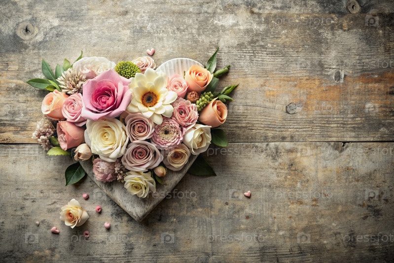 Открытка, баннер Дня матери с розовыми цветами, сердца на винтажном сером деревянном фоне