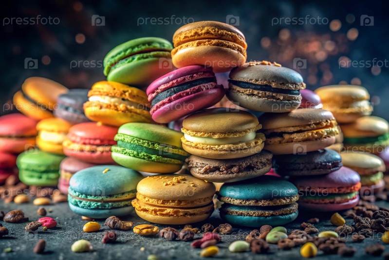 Традиционная яркая французская макароны. многоцветные пасты на темном фоне. вкусный десерт