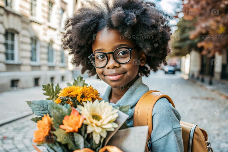 Красивая афроамериканка на очках с букетом осенних цветов впервые идет в школу. Ребенок со школьной сумкой, книгой и цветами. Малыш на городской улице