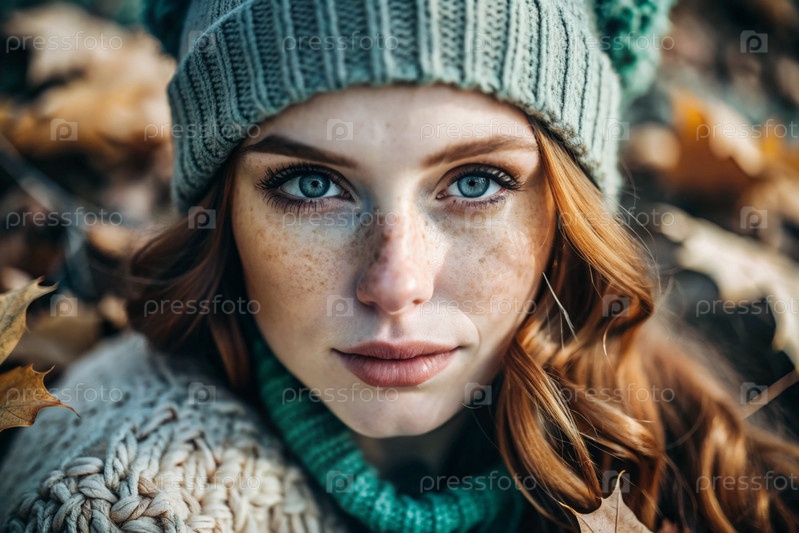 Осенний портрет. Близкий план молодой рыжеволосой женщины с выразительными зелеными глазами в вязанной шляпе и свитере