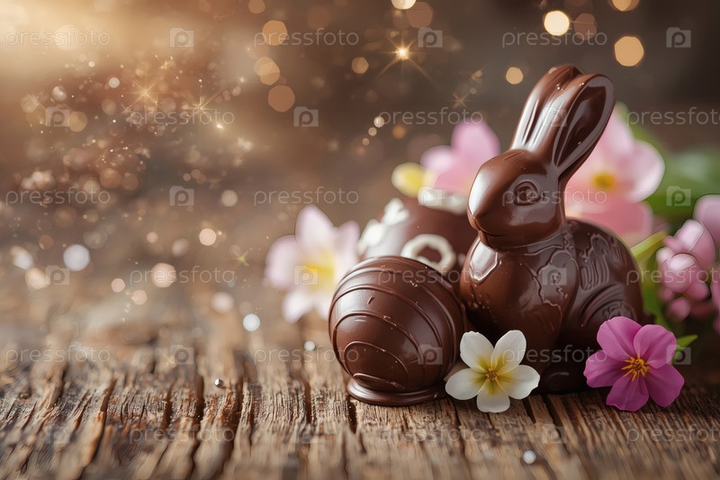 Концепция ярких пасхальных праздников в 2026 году. Хорошая открытка. Баннер. Шоколадные пасхальные яйца, шоколадный кролик и весенние цветы на деревянном фоне. Пасхальные сладости и угощения