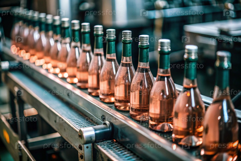 Пищевая промышленность. Конвейерная лента. Линия розного вина в стеклянных бутылках на фабрике. Близкий план бутылки розового игристого вина