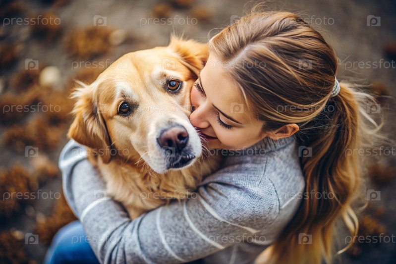 Животные.Молодая женщина обнимает собаку.Сознательная жизнь с питомцем, понятие дружбы и любви к животным