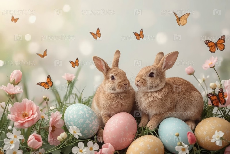 Пасхальные кролики лежат на пасхальных яйцах и смотрят в камеру