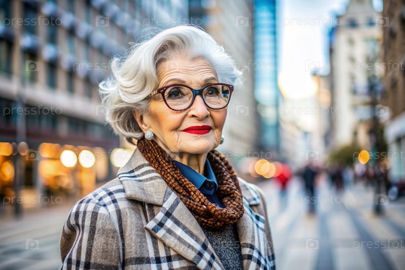 Портрет стильной, модной пожилой женщины, 70-летнего пенсионера на улице с очками и одеждой в спокойных бежевых тонах