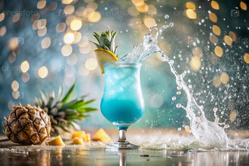 Стакан вкусного синего коктейля Pina Colada перед бассейном. алкогольный коктейль сочный фруктовый синий с ликером, кубиками льда и ананасом