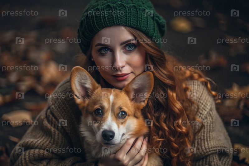 Женщина обнимает валлийскую собаку Корги в осеннем парке.Сознательная жизнь с домашним животным, концепция дружбы и любви к животным