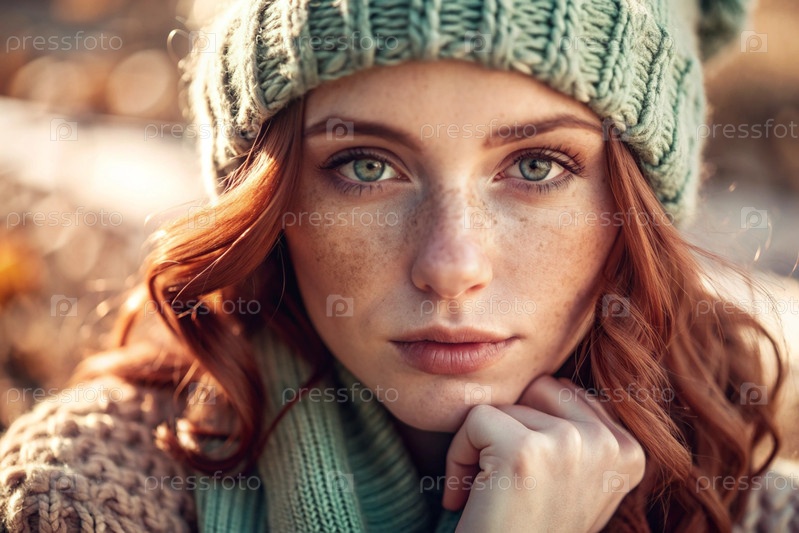 Осенний портрет. Близкий план молодой рыжеволосой женщины с выразительными зелеными глазами в вязанной шляпе и свитере