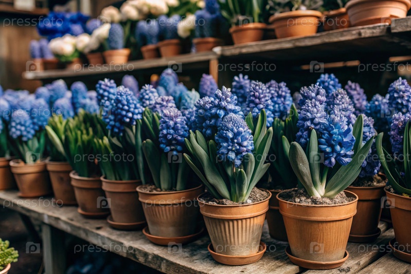 Голубые гиацинты в стильных глиняных горшках на яркой витрине цветочного рынка идеально подходят для украшения домашних садов ранней весной