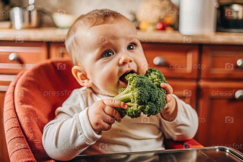Здоровое детское питание. Первая еда. Кормить ребенка. Милый ребенок ест брокколи. Свежие овощи и фрукты