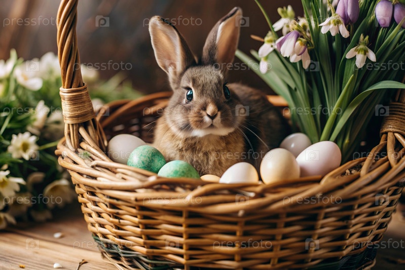 Баннер. пасхальный кролик в корзине из красочных пасхальных яиц вокруг весенних снегопадов и первичной розы. концепция праздника Пасхи