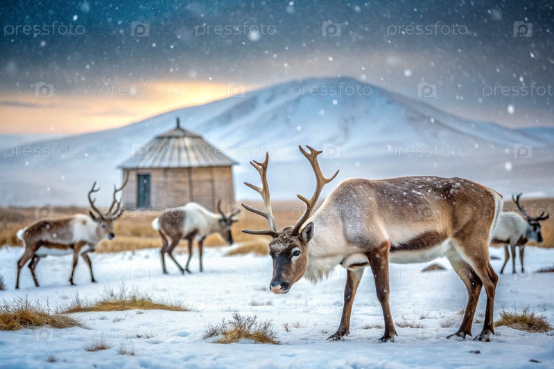 Олени пасутся против тундрового ландшафта и зимней юрты