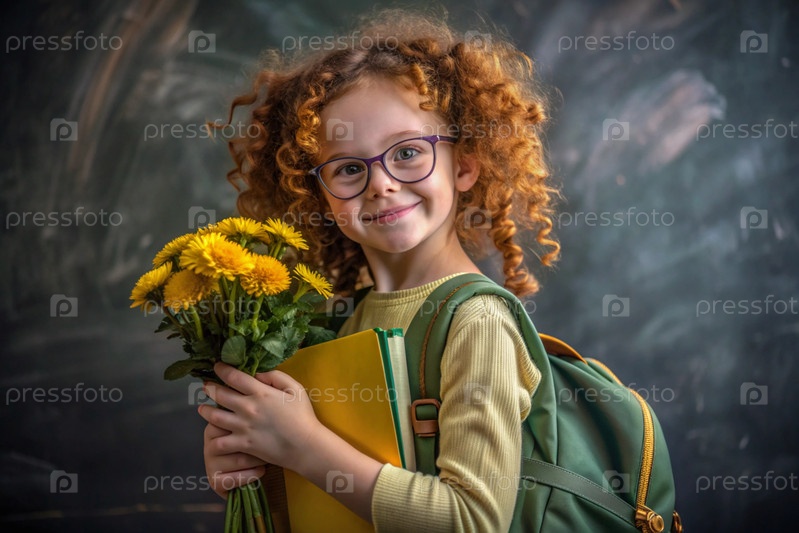 рыжеволосая скандинавская девочка со своими очками у доски. девушка держит цветы в руках. это ее первый раз, когда она ходит в школу. ребенок с рюкзаком, книгой и цветами. обратно в школу