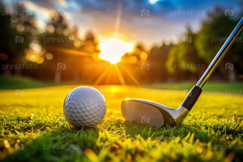 Баннер. белый мяч и металлическая клюшка для гольфа лежат на газоне в руках мужчины среди заката солнца. реклама матча по гольфу в кантри-клубе. свободное место для текста