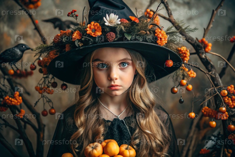 Осенний портрет красивой девушки в костюме ведьмы с осенними ягодами, тыквами и черными птицами. баннер, открытка. концепция Хэллоуина