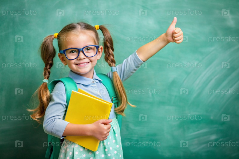 Красивая девушка в очках показывает класс своей рукой. Ребенок идет в школу впервые. Ребёнок с школьной сумкой и книгой. Ребенок в классе со доской на заднем плане. Назад в школу