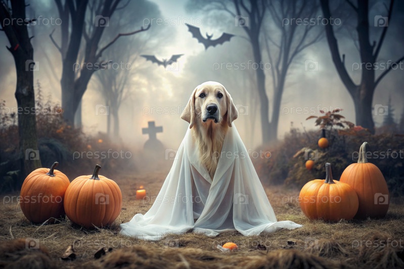 Собака в костюме призрака Хэллоуина. золотой ретривер сидит в мрачном осеннем парке с крестами, летучими мышами и тыквами
