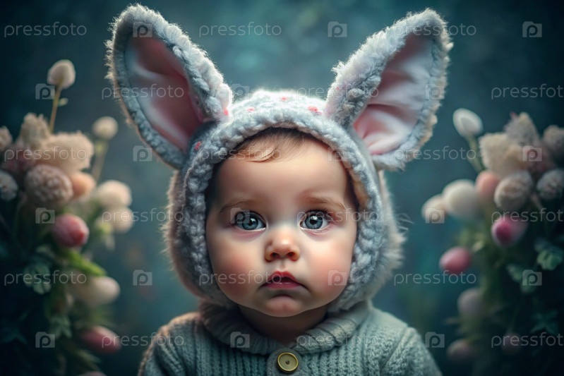 Баннер. Винтажная открытка. Девушка в костюме пасхального кролика с милыми ушами. Концепция праздника Bright Easter Spring