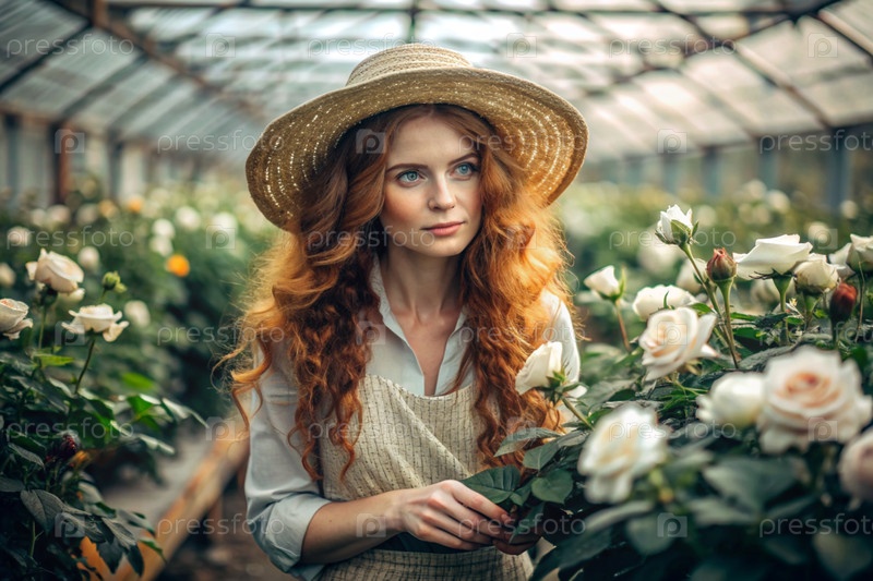 Портрет красивого садовника с рыжими волосами в соломенной шляпе, работающего с розами в стеклянной теплице