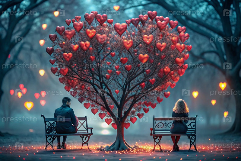 Красивое фантастическое дерево в форме сердца, сияющее среди деревьев парка и скамейка для влюбленных на сказочном фоне боке-стиля