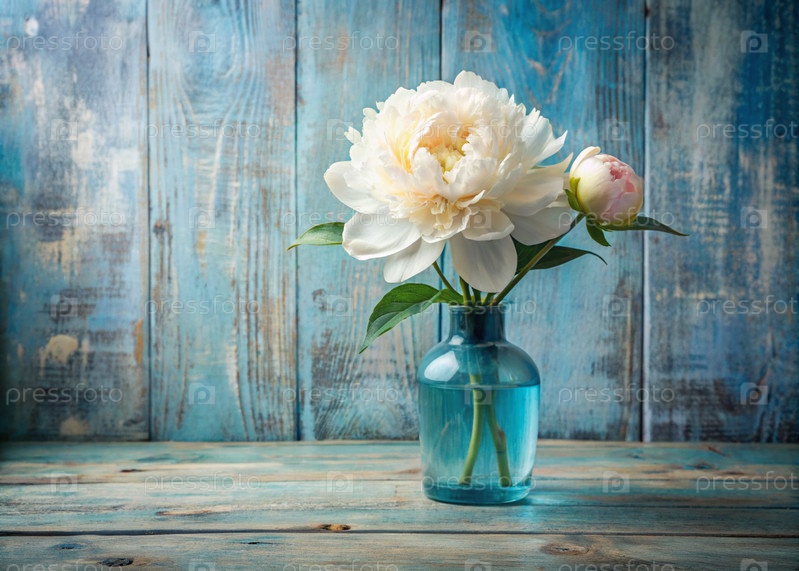 Красивые бело-розовые пионы в стеклянных вазах и бутылки на деревянном шкафчике. Цветы и почки в вазе. Светлый, белый, розовый и синий цветочный фон