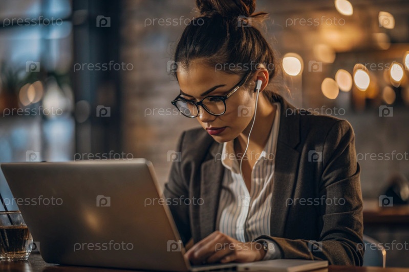 Молодая женщина фрилансер в очках и наушниках работает на ноутбуке или делает покупки в интернет-магазине