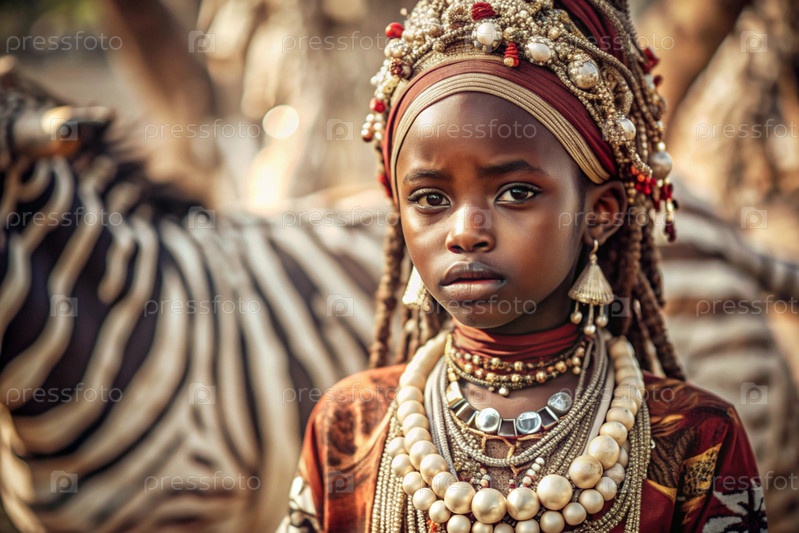 Красивая африканская девушка в традиционном национальном костюме против зебры портрет символизирует традиции и красоту африканского народа