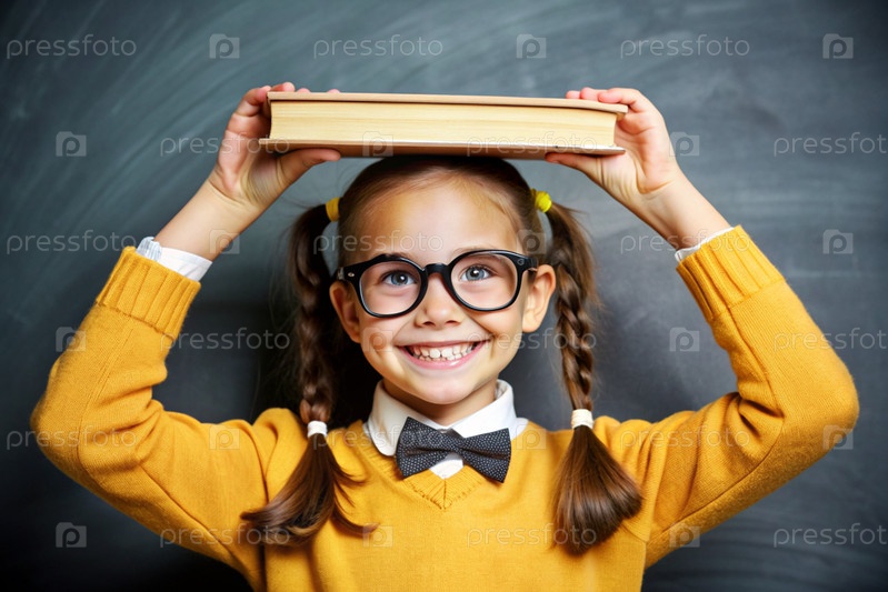 Красивая девушка с очками и книгами на голове. Ребенок впервые идет в школу. Ребёнок в классе со доской на заднем плане. Возвращение к школе