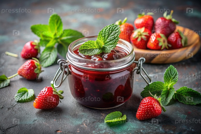 Банка домашней клубники, здоровый варенье с мятой на черном фоне.Сохранение и уборка летом
