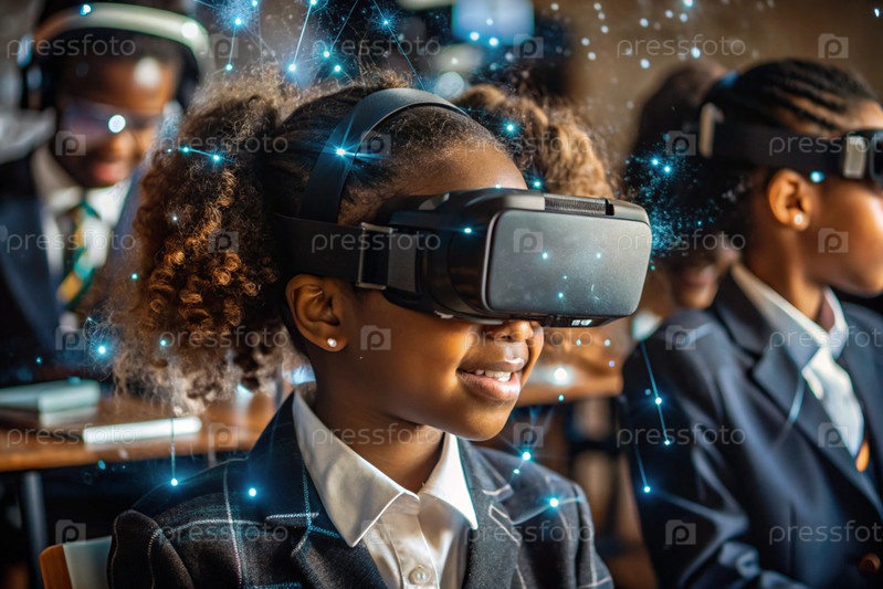 Чернокожая африканская девушка с очками виртуальной реальности.Ребенок находится в классе, а другие ученики на заднем плане.Цифровой интерфейс отображается в наушниках