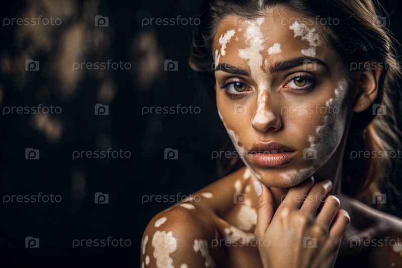 Лейкодермия. Витилиго. Плохая пигментация кожи. Большие белые пятна по всему телу и лицу. Портрет красивой девушки с кожными заболеваниями