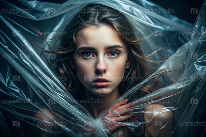 Девочка завернута в целлофан или сумку. Девушка задыхается. Пластиковое загрязнение планеты. Опасность для окружающей среды. Сокращение повторного использования пластика. Переработка. Концепция мусора